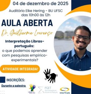 A PGET/UFSC convida para a defesa de dissertação de mestrado de Samuel dos Santos Silva Jesus, intitulada: “Tribunal de Justiça do Estado de São Paulo e intérpretes de Libras-Português: uma análise das intersecções do uso do gênero acórdão e implicações profissionais para contextos judiciais”.